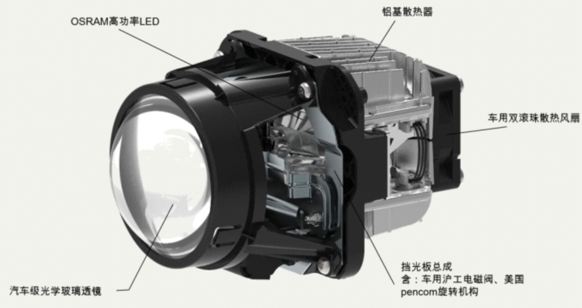 A. LED dual-light lens group: product assembly, through the movement of the beam baffle, to achieve the near-high beam switch.